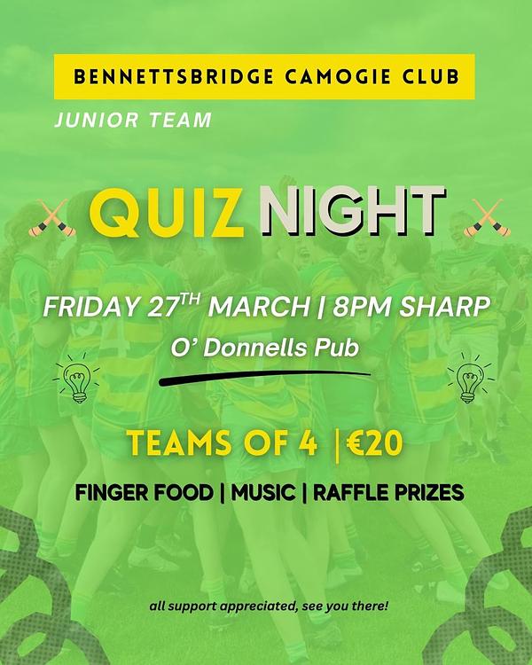 Our Junior team are hosting a quiz night in O' Donnells Pub Bennettsbridge on Friday 27th of March at 8pm. Table of four €20. Raffle prizes, food and music on the night. Please come and support